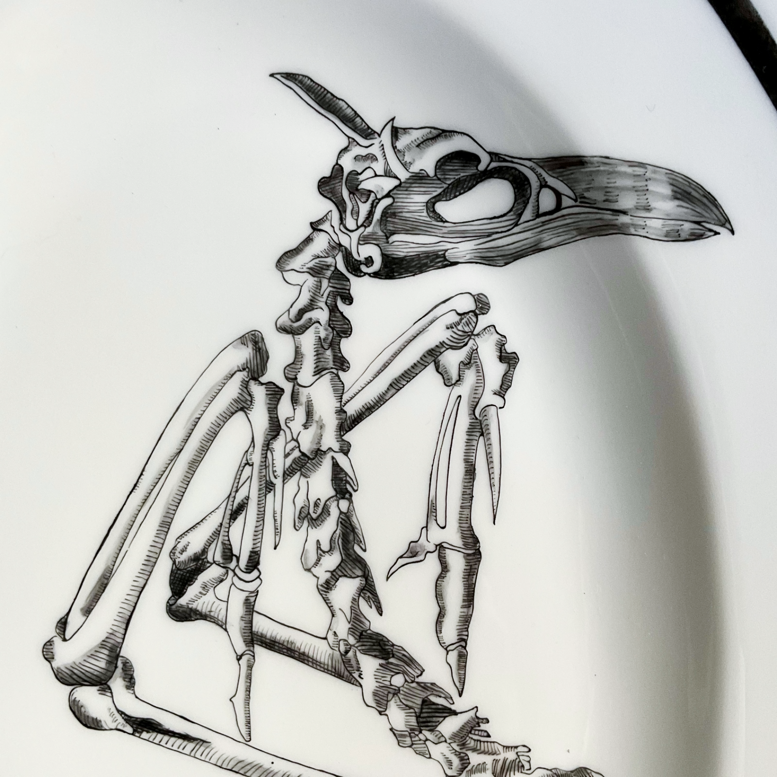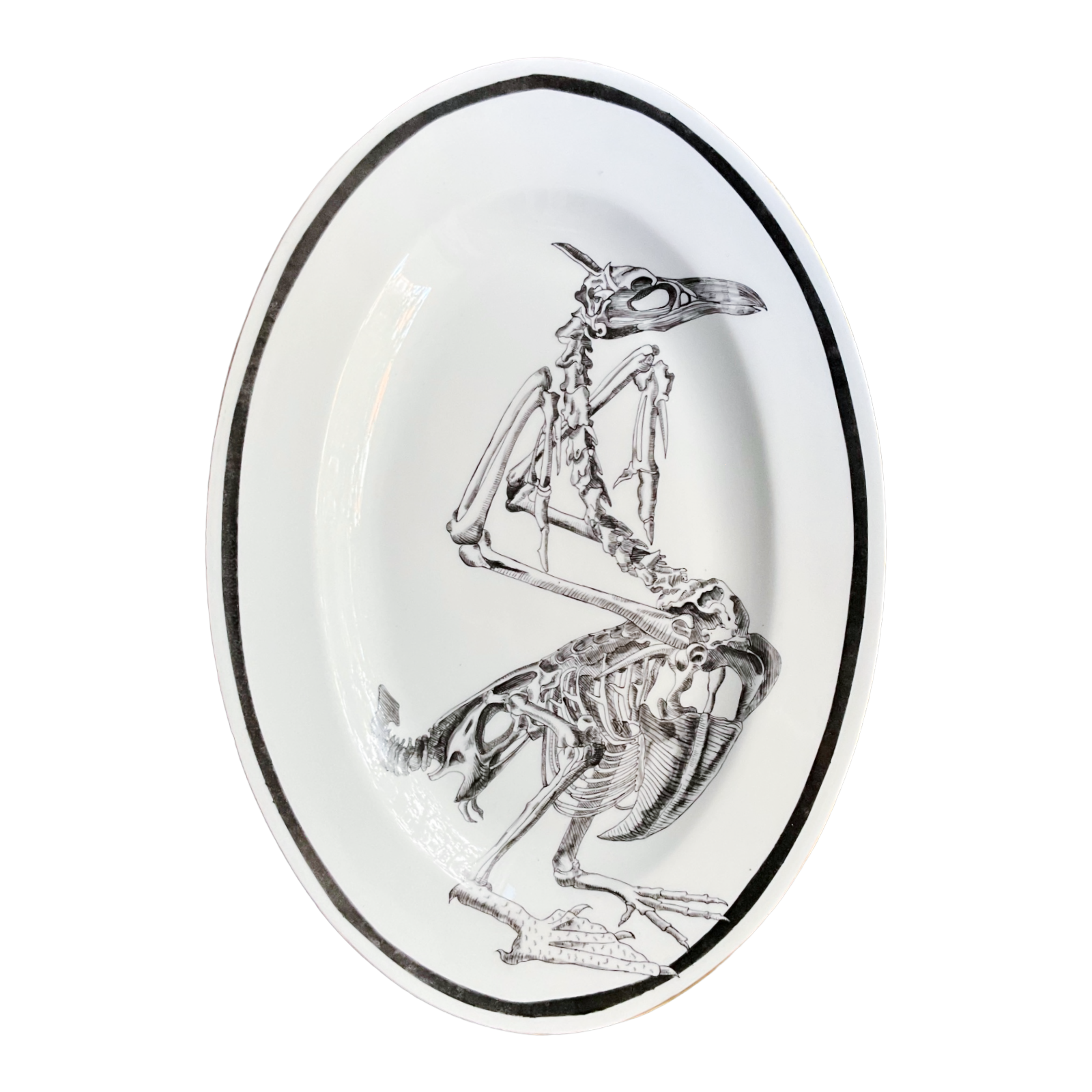 Vassoio dipinto a mano, rappresentante un’illustrazione di Ulisse Aldrovandi (naturalista, 1522-1605) intitolata Carbonia Acquatici Sceleton (Scheletro di cormorano). Lungo il taglio del vassoio, corre un filo di lustro d’oro (dil. 10%).